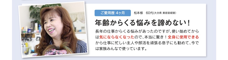 全体的にすぐ楽になるし、気をつけても出来てしまう両手の肌荒れもよくなっているので本当に驚き! 同じ悩みを持つ友人にもすすめています。(40代女性 奈良県 美容室オーナー)