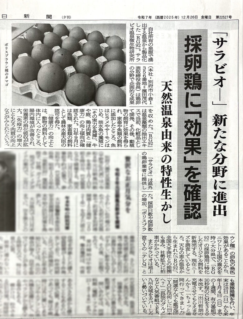 2025年12月29日 2025年12月26日発行の今日新聞にて記事が掲載されました 別府市を中心に発行されている「今日新聞」2025年12月26日発行版にて、サラビオの採卵鶏に関する記事が掲載されました。 今日新聞ウェブサイトはこちら 関連記事 2022年4月27日 ペットを理由に仕事を休みづらい人は約8割! 働きながらペットと暮らしやすい社内環境をつくる“日本初“最高動物福祉責任者 「CAO」を役職として新設 株式会社 SARABiO 温泉微生物研究所(本社:大分県別府市、代表取締役社⻑:濱田拓也、以下当社)は、働きながらペットと暮らしやすい就業環境の創出と啓蒙を目的とした役職「最高動物福祉責任者(CAO)」を新設しました。C […] 2020年2月28日 SARAVIO から SARABiOへ。新ロゴ決定 「温泉微生物研究のパイオニアとして。さらなるバイオ研究への思いを込めて社名とロゴを一新しました。 2020年11月30日 GWの客数は98%減!“毎日が地獄”の別府温泉を救えご当地グルメ弁当を大分のアンテナショップが発売 ~漁師飯「りゅうきゅう丼」など3種をテイクアウト&デリバリー~ 世界一の温泉源泉数を誇る大分県の魅力を発信する「おおいたアンテナショップ 温泉座(所在地:東京都千代田区有楽町、以下 温泉座)」は、大分県の郷土料理を贅沢に […]