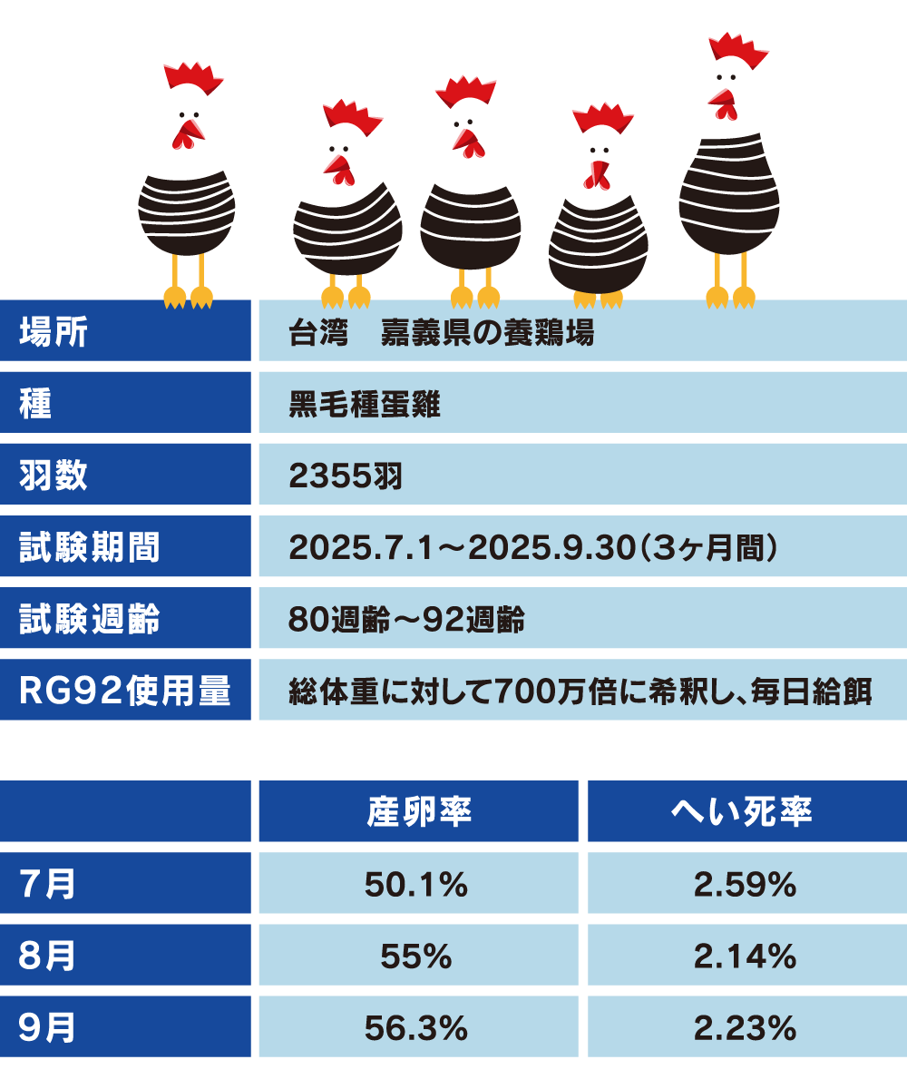ご報告いただいた養鶏農家様の所在する台湾は、年間を通して高温多湿な気候であり、特に夏期には産卵率の低下やへい死率の上昇が起こりやすい環境です。