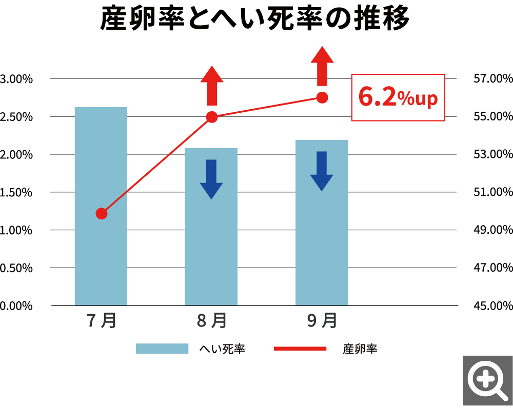 導入の結果、産卵率が最大で6.2%アップ。へい死率(死亡率)も低下し、健康状態の安定が確認されました。