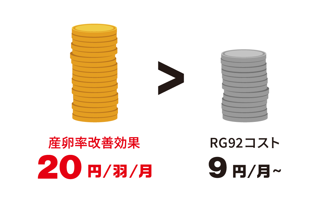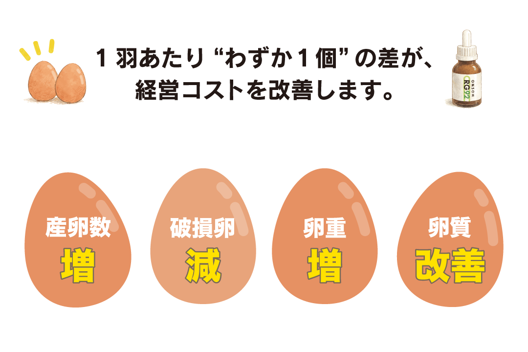 今年は6月から真夏日が続き、餌食いや卵重に影響が出るだろうと心配してました。エキスの効果は体験済みで、自社配合の餌に混ぜる粉末を待っていました。RG92パウダーで夏場の卵重もしっかり乗り今夏を乗り切ることができました。
